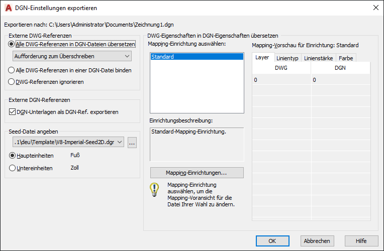 Standard ist die vorgabemäßige Mapping-Einrichtung, die Daten aus der exportierten Zeichnung extrahiert und ein automatisches Mapping für DGN-Layer, Linientypen, Linienstärken und Farben, wie in der Mapping-Voransicht angezeigt, verwendet.
