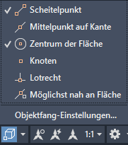 | Finden | 2D-Objektfang | Fängt den Cursor am nächstgelegenen 2D Referenzpunkt, während Sie ihn bewegen. Beispielsweise Endpunkte, Mittelpunkte von Kreisen, Mittelpunkte und so weiter. |