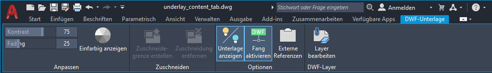 Wenn Sie eine DWF-Unterlage in einer Zeichnung auswählen, wird die Kontextabhängige Registerkarte DWF-Unterlage in der Multifunktionsleiste angezeigt.