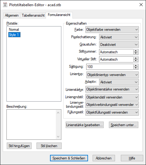 Beide Registerkarten enthalten sämtliche in der Plotstiltabelle enthaltenen Plotstile sowie die dazugehörigen Einstellungen.