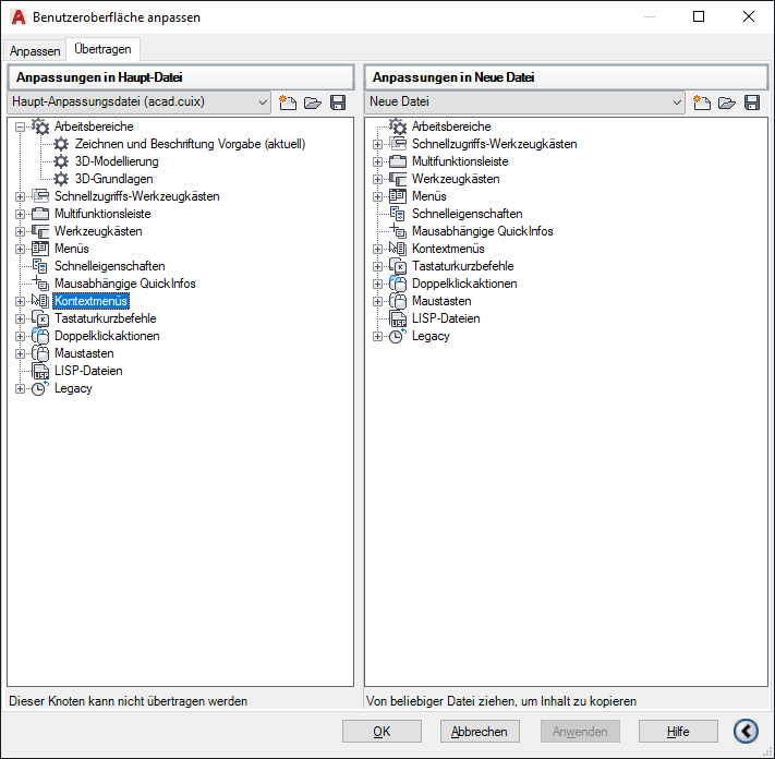 Wenn Sie in der Befehlszeile ABIIMPORT eingeben, wird die CUIx-Hauptdatei im rechten Fensterbereich angezeigt (vorgabemäßig acad.cuix für AutoCAD-Dateien oder acadlt.cuix für AutoCAD LT-Dateien). Um Daten zu übertragen, öffnen Sie die CUIx- oder eine Legacy-Anpassungsdatei im linken Bereich. Wenn Sie in der Befehlszeile ABIEXPORT eingeben, wird die CUIx-Hauptdatei im linken Fensterbereich angezeigt. Um Daten zu übertragen, öffnen Sie die CUIx- oder eine Legacy-Anpassungsdatei im rechten Bereich.