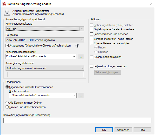 Wenn Sie dieses Feld nicht ausfüllen, wird die Konvertierungsdatei in dem Ordner erstellt, der die zuerst festgelegte Zeichnungsdatei enthält. In einem Plansatzkontext wird die Konvertierungsdatei in dem Ordner angelegt, der die Plansatzdatendatei (DST) enthält.