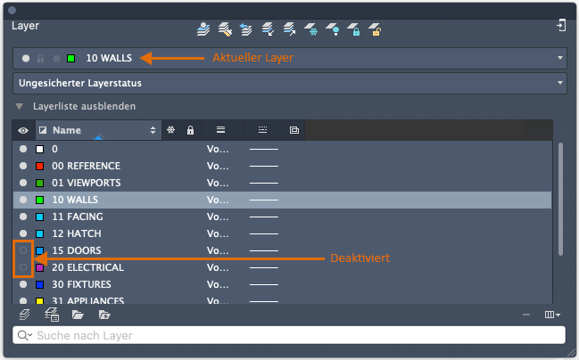 Beachten Sie in der Spalte Sichtbarkeit, dass die Kreissymbole für zwei Layer nicht ausgefüllt sind. Diese Layer wurden deaktiviert, um die Türen und Stromleitungen im Grundriss auszublenden.