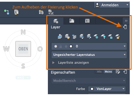 Um zu sehen, wie eine Zeichnung organisiert ist, verwenden Sie die Layer-Palette. Die Layer-Palette ist vorgabemäßig auf der rechten Seite über der Eigenschaftsprüfung fixiert. Heben Sie die Fixierung der Palette auf, um die Größe der Palette und der einzelnen Spalten in der Palette zu ändern.
