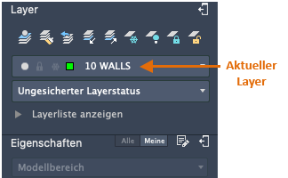 Wie angegeben, ist Layer 10 WALLS der aktuelle Layer. Alle neuen Objekte werden automatisch auf diesem Layer platziert.