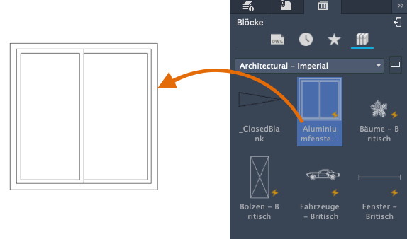 Sie können auch nach einer Zeichnungsdatei suchen und sie als Block einfügen oder die Blöcke in der Zeichnung in der Blockpalette anzeigen.
