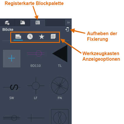 Die Blockpalette wird zum Einfügen von Blöcken verwendet.
