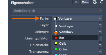 Die Palette Eigenschaftsprüfung enthält eine Liste aller wichtigen Eigenschafteneinstellungen. Sie können jedes der verfügbaren Felder klicken, um die aktuellen Einstellungen zu ändern. Wie in folgendem Beispiel dargestellt, wird die aktuelle Farbe von VonLayer zu Rot geändert, wenn keine Objekte ausgewählt sind. Allen nachfolgend erstellten Objekten wird die Farbeigenschaft Rot zugewiesen.