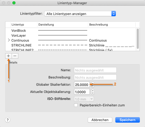 Klicken Sie im Menü Format auf Linientyp. Hierdurch wird das Dialogfeld Linientyp-Manager aufgerufen.