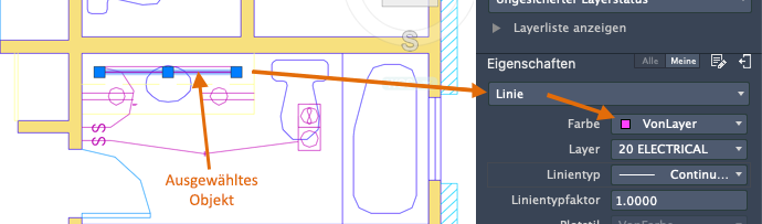 Beachten Sie, dass die aktuellen Eigenschaften des ausgewählten Objekts in der Palette angezeigt werden. Sie können jede dieser Eigenschaften ändern, indem Sie darauf klicken und die betreffende Einstellung ändern. Eine Eigenschaft, die auf VonLayer eingestellt ist, übernimmt die Einstellung vom Layer. Im vorherigen Beispiel sind die Objekte, die auf dem Layer 20 ELECTRICAL erstellt wurden, violett, da dies die vorgegebene Farbe der Objekte auf diesem Layer ist.