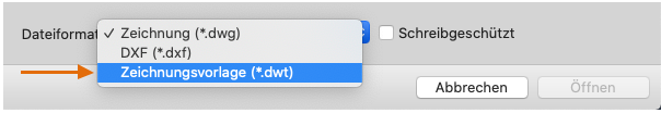 Wenn Sie selbstständig arbeiten, können Sie Ihre Zeichnungsvorlagendateien entsprechend Ihren Anforderungen erstellen. Im Laufe der Zeit können Sie auch Einstellungen für zusätzliche Funktionen hinzufügen. Um eine vorhandene Zeichnungsvorlagendatei zu ändern, klicken Sie auf Öffnen, geben im Dialogfeld Zeichnungsvorlage (*.dwt) an und wählen die Vorlagendatei.