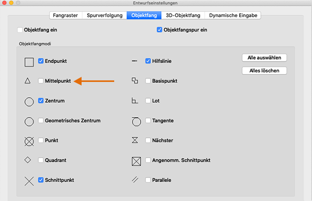Um den Objektfang zu aktivieren bzw. zu deaktivieren, drücken Sie F3 oder auf der Touch Bar.