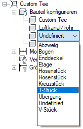 Sie legen den Bauteiltyp (z. B. T-Stück oder Bogen) mithilfe einer vordefinierten Liste im Bauteil-Browser fest. Diese Auswahl basiert auf der Gebäudesystemdomäne und dem aktuellen Bauteilkatalog.