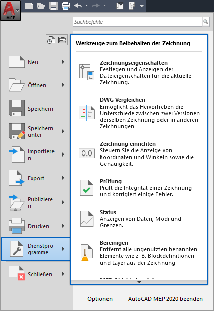 Der Menü-Browser enthält Befehle, die für die gesamte Zeichnung relevant sind.