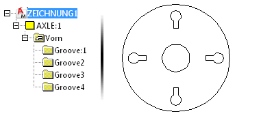 In diesem Beispiel enthält der Ordner Groove:1 die obere Nut. Er ist so angeordnet, dass andere Nuten erstellt werden können. Weil Ordner assoziativ sind, werden bei Änderung einer Nut alle Nuten aktualisiert.