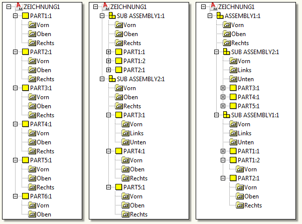 Der wichtigste Vorteil der Mechanical-Struktur ist die Möglichkeit des Wiederverwendens. Definierte Komponenten (Teile oder Unterbaugruppen) können genau wie Blöcke beliebig oft eingefügt werden. Die Stückliste wird automatisch aktualisiert.