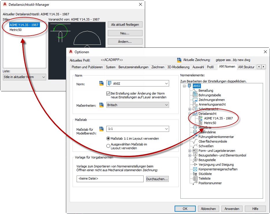 Die Einstellungen, mit denen die Darstellung von AutoCAD Mechanical-Toolset-Objekten gesteuert wird, werden in einer benannten Sammlung von Einstellungen gespeichert, die als Zeichnungsnorm bezeichnet wird. Daher unterscheidet sich die Art und Weise, in der Detailansichtsstile für AutoCAD-Objekte (Modelldokumentation-Detailansichten) gelten, von der Art und Weise, in der sie für AutoCAD Mechanical-Toolset-Objekte (AMDETAIL-Detailansichten) gelten. Daher gilt: