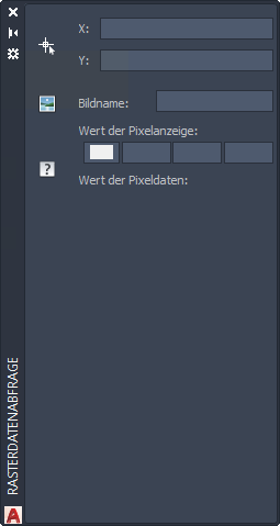 Gibt weitere Datenwerte der Pixel unter dem Cursor an. Die Werte hängen vom Bildtyp ab. Ein Indexfarben- oder Graustufenbild kann z. B. die Werte 0-255 haben. Wenn das Bild im 32-Bit-Gleitkommaformat mit Palettenfarbkarte vorliegt, kann es sich bei den Daten hier je nach Farbkarte um Erhebung, Neigung oder Aussehen handeln.