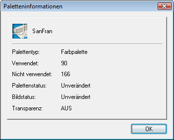 Informationen. Im Dialogfeld Paletteninformationen wird angezeigt, dass nur 90 der verfügbaren 256 Farben verwendet werden und dass für das Bild keine Hintergrundtransparenz aktiviert ist. Klicken Sie auf OK.