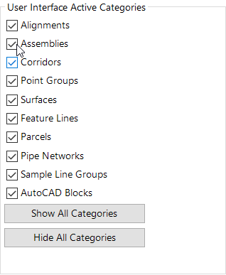 When undertaking certain tasks in Project Explorer, it is sometimes preferable to disable or hide any Civil 3D Object Categories from the Project Explorer window which are not in use.