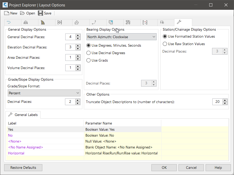 Allows the number of decimal places to be specified for elevations, slopes/grades, areas, volumes, and other numeric values.
