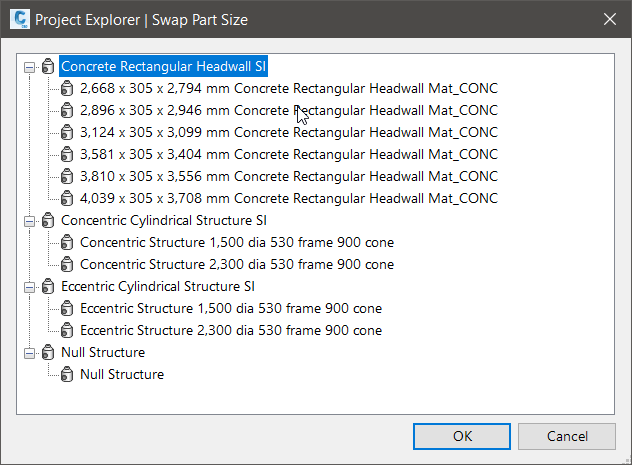 To modify the part size of multiple structures or pipes, select the Pipe Networks tab in the Project Explorer window and ensure that the structures or pipes sub-object tab is active. Select the structures or pipes that you would like to assign the new part size to, then select Swap Parts from the right-click menu. Any changes are reflected instantly in the AutoCAD viewport and the Project Explorer window.