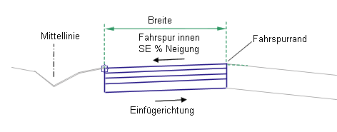 Die Überhöhungsneigung der Außenfahrspur wird aus den Querneigungsangaben für die Basislinienachse ermittelt. Das Vorzeichen dieses Wertes wird umgekehrt. Wenn Sie nach links einfügen, wird die Neigung der rechten Außenspur ermittelt und umgekehrt. Wenn Sie nach rechts einfügen, wird die Neigung der linken Außenspur ermittelt und umgekehrt. Beginnend am Zuordnungspunkt wird ein Deckschicht-DGM mit parallelem Untergrund unter Verwendung der angegebenen Breite, Tiefe und der umgekehrten Überhöhungsneigung eingefügt. Vertikale Verknüpfungen schließen die Profilart an beiden Enden der Fahrspur ab.
