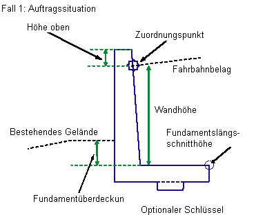 | FundamentÜberdeckung | Die Tiefe der Überdeckung vom oberen Ende des Fundaments bis zur Oberkantenneigungslinie auf der Wandrückseite im Auftrag oder bis zum Ansatz im Abtrag. | Numerisch |