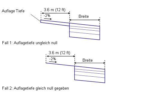 In der Entwurfsdarstellung kann dieser Querschnittsbestandteil jedem geeigneten Punkt zugeordnet werden. Die Auflageschicht wird über eine Breite von 3.6 m oder 12 ft und verlängert mit einer Neigung von -2 % mit einer einheitlichen Stärke dargestellt. Wenn Auflage Tiefe gleich null ist, wird die Auflage als eine einzelne Verknüpfung dargestellt. Die Aufweitungsfahrspur erstreckt sich von der Auflagekante mit einer Neigung von -2%.