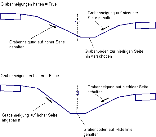 In den Fällen, wo sich die höchsten Punkte der Grabenneigungen nicht auf gleicher Höhe befinden, wählt dieser Parameter, ob die Grabenböschungen beibehalten werden und die Position des Grabens verschoben wird oder ob der Graben mittig beibehalten und die Böschung auf der höheren Seite angepasst wird. |