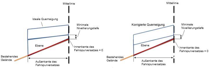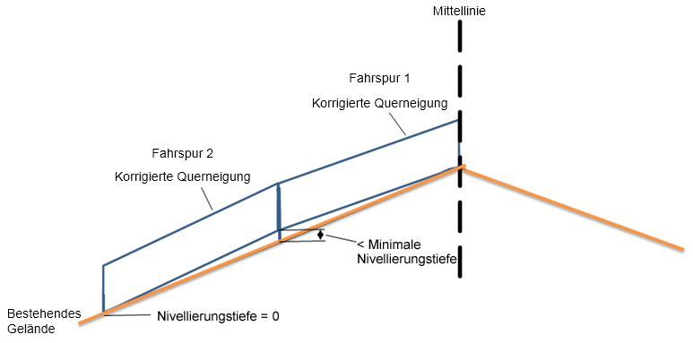 Die korrigierte Querneigung wird berechnet und angewendet, es wird jedoch keine Höhenanpassung oder Flattern angewendet. In einigen Fällen wird evtl. die minimale Nivellierungstiefe nicht erreicht.
