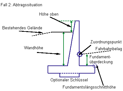 | FundamentÜberdeckung | Die Tiefe der Überdeckung vom oberen Ende des Fundaments bis zur Oberkantenneigungslinie auf der Wandrückseite im Auftrag oder bis zum Ansatz im Abtrag. | Numerisch |