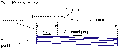 Breite der Innenfahrspur, falls kein Mittelstreifen vorhanden ist, d. h. vom Zuordnungspunkt zum Neigungsunterbrechungspunkt |