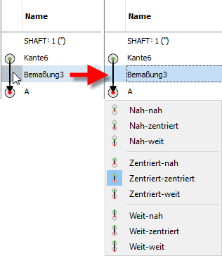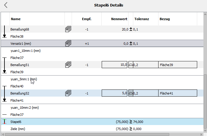 - Name: In dieser editierbaren Spalte werden der Name des Bauteils, das Element, die Bemaßung, die berechnete Baugruppenverschiebung und die berechnete Bezugsverschiebung angezeigt.