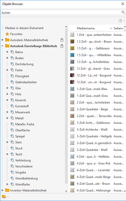 Im Objekt-Browser werden verfügbare Medien verwaltet und überprüft. Hier werden auch Medien gesucht, die einem Material hinzugefügt oder ein vorhandenes Medium eines Materials ersetzen sollen.