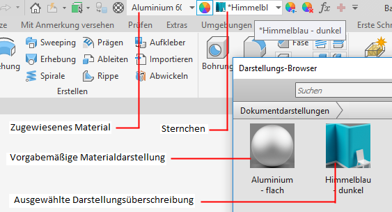Anmerkung: Materialien verfügen über vorgegebene Darstellungszuweisungen. Beim Überschreiben der Darstellung wird ein Sternchen vor ihrem Namen im Schnellzugriff-Werkzeugkasten hinzugefügt. Dies soll darauf hinweisen, dass die zugewiesene Darstellung nicht die Standarddarstellung ist.