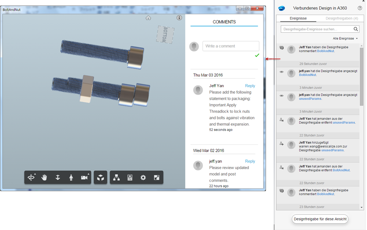 Eigentümer und Teamkollegen, die über Inventor 2017 verfügen, können jetzt eine Konstruktionsfreigabe öffnen, anzeigen und Kommentare im Anzeigefenster innerhalb von Inventor veröffentlichen.