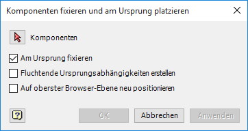 Außerdem unterstützt der Befehl Fixieren und am Ursprung platzieren die Mehrfachauswahl. Sie können eine oder mehrere Komponenten und dann eine oder mehrere Optionen im neuen Dialogfeld Komponente fixieren und am Ursprung platzieren auswählen.