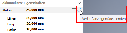 Alle Werte können der Akkumulierungsliste schnell hinzugefügt oder von dieser gelöscht werden. Jede akkumulierte Eigenschaftengruppe kann einzeln gelöscht werden. Die Liste der ausgewählten Werte kann ein- oder ausgeblendet werden. Verwenden Sie das Kontextmenü zum Kopieren von einzelnen oder Gesamtwerten in die Zwischenablage. Alle akkumulierten Eigenschaften werden gelöscht, wenn der Befehl Messen geschlossen wird.
