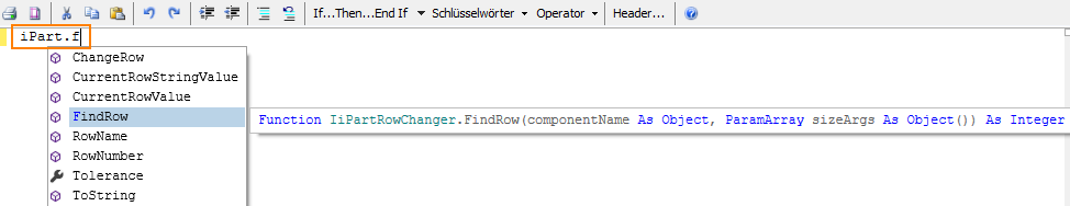 Geben Sie z. B. "." nach einer Variable ein, und beginnen Sie mit der Eingabe, oder drücken Sie zu einem beliebigen Zeitpunkt STRG + LEERTASTE oder ALT + PFEIL NACH RECHTS. Während der Eingabe wird eine Liste der verfügbaren Auswahlmöglichkeiten in alphabetischer Reihenfolge angezeigt. Eine vollständige Beschreibung der Variablen wird in einer QuickInfo angezeigt.