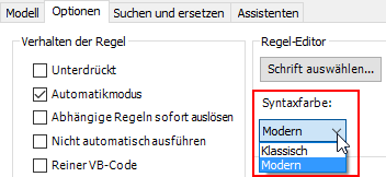 | Registerkarte Regel-Editor-Optionen | Beispiel für die neue Syntaxfarbe |