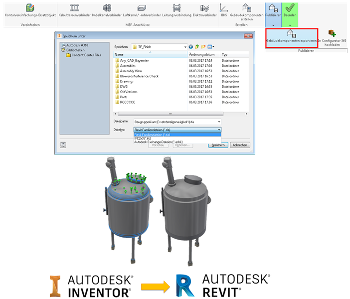 BIM-Inhalt wurde im Hinblick auf die Arbeitsabläufe für Vereinfachung, Erstellung und Publizierung verbessert. Mit Inventor 2018 können Sie direkt in den IFC- und Revit-Dateiformaten (RFA-Dateien) publizieren.