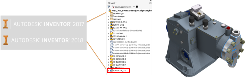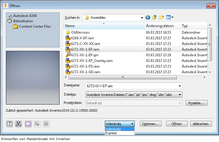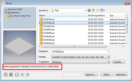 In Inventor 2017.4 wurde AnyCAD erweitert, sodass Sie Inventor 2018-Dateien in Inventor 2017-Konstruktionen verwenden können. Dies bedeutet, dass Sie jetzt mit anderen Benutzern zusammenarbeiten können, die frühere oder spätere Inventor-Versionen verwenden als diejenige, mit der Sie arbeiten. Um die Version einer Inventor-Datei zu ermitteln, wird im Dialogfeld Öffnen jetzt die Inventor-Version angezeigt, in der eine Datei zuletzt gespeichert wurde.