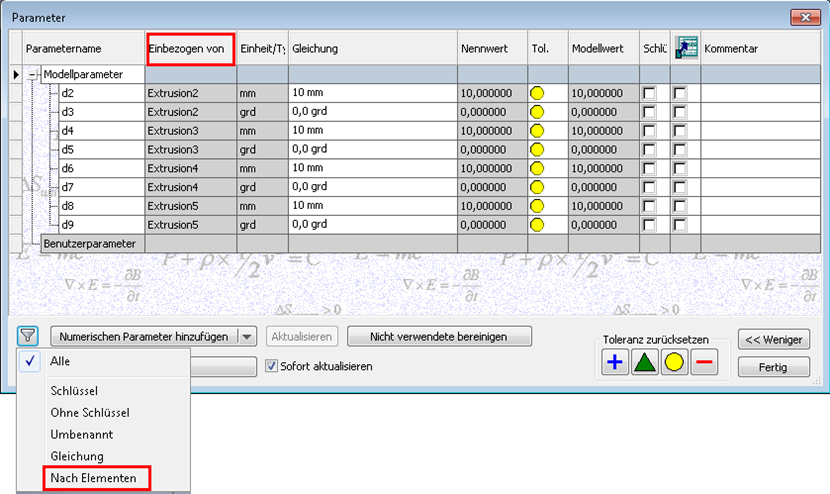 Das Dialogfeld Parameter wurde verbessert und enthält nun eine Spalte Einbezogen von sowie einen Filter Nach Elementen.