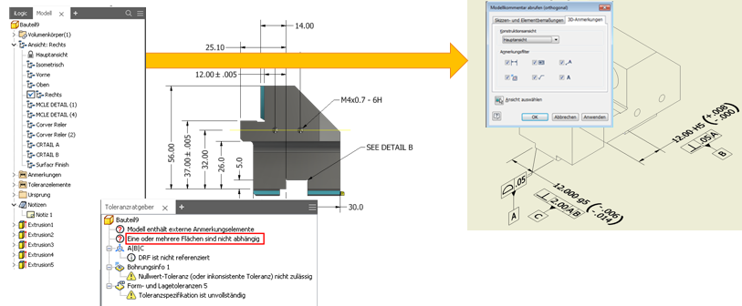 Modellbasierte Definition (MBD) bezeichnet eine Reihe neuer leistungsstarker Werkzeuge, mit denen Sie Anmerkungen, Form- und Lagetoleranzen und andere Herstellungsinformationen direkt zu 3D-Bauteilen hinzufügen können. Der integrierte Toleranzratgeber prüft die Integrität Ihres Toleranzschemas und listet mögliche Probleme, Fehler und andere Informationen im Browser des Toleranzratgebers auf. Nachdem Sie MBD und 3D-Anmerkungen auf Ihr 3D-Modell angewendet haben, können Sie in der 2D-Konstruktion eine Wiederherstellung vornehmen und in eine 3D-PDF- oder STEP AP242-Datei exportieren.