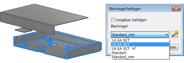 Blechteile mit mehreren Körpern unterstützen nun spezifische Regeln und Stärken für jeden Körper. Mehrkörperregeln können auf Körper im Browser oder beim Erstellen neuer Körper innerhalb der Dialogfelder Fläche, Konturlasche, Konturrolle und Übergangslasche angewendet werden.