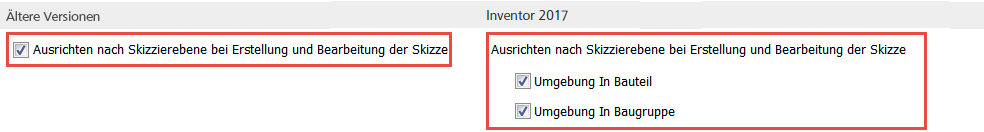 Registerkarte Skizze gibt es jetzt separate Einstellungen zum Steuern des Verhaltens von Ausrichten nach in einer Baugruppenskizze und zum Steuern des Verhaltens von Ausrichten nach in einer Bauteilskizze.