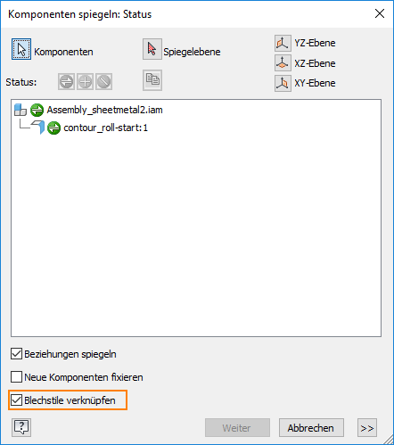 Der Befehl Komponenten spiegeln erkennt jetzt Blechbauteile, und Sie können den Blechstil der Quellkomponente mit der gespiegelten Kopie verknüpfen.