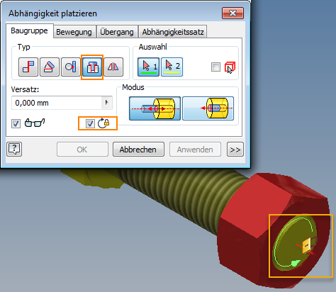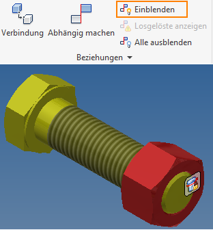 | Ein Sperrsymbol wird im Grafikfenster angezeigt, wenn Sie bei ausgewählter Option Drehung sperren eine Abhängigkeit Einfügen platzieren. Vorgabemäßig wird das Sperrsymbol nach dem Schließen des Dialogfelds Abhängigkeit platzieren nicht mehr angezeigt. | Um das Sperrsymbol im Grafikfenster anzuzeigen, nachdem Sie das Dialogfeld geschlossen haben, klicken Sie auf Zusammenfügen Gruppe Beziehungen