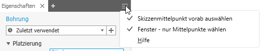 Skizzenmittelpunkt vorab auswählen - Wenn Sie diese Option aktivieren, werden alle nicht verwendeten Skizzenmittelpunkte in der aktiven Skizze automatisch für die Verwendung durch den Befehl Bohrung ausgewählt, und alle Mittelpunkte werden mit einer Bohrung versehen.
